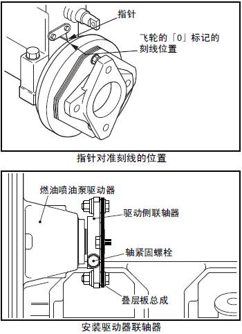 (3) 連接疊層板、驅(qū)動(dòng)器聯(lián)軸器,用螺栓臨時(shí)固定。這時(shí),確認(rèn)在No.1、7 壓縮上死點(diǎn)位置處時(shí)三菱R16柴油發(fā)動(dòng)機(jī)燃油噴油泵三菱R16柴油發(fā)動(dòng)機(jī)飛輪的記號(hào)「0」的刻線在指針附近。
