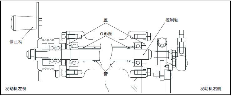 (3) 控制軸的左側(cè)端部,和球軸承、卡環(huán)、端板一起,安裝連接調(diào)速器執(zhí)行器的三菱R16柴油發(fā)動(dòng)機(jī)連桿柄。