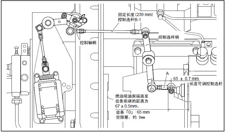 (6) 當(dāng)停機(jī)柄扳至停止側(cè)末端( 齒條「0」) 時(shí),確認(rèn)噴油泵和齒條前端的距離為65 mm,游隙量為2 mm。