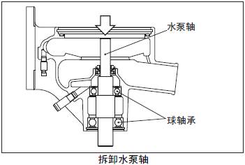 用手動(dòng)壓力器等在三菱S16柴油機(jī)水泵軸的葉輪側(cè)端面加壓,將三菱S16柴油機(jī)水泵軸和球軸承一起拆卸。