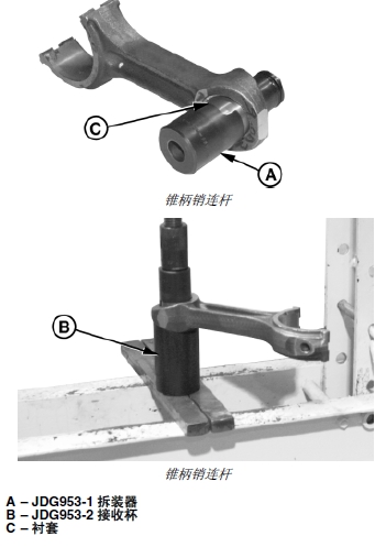 1. 使用 JDG953 連桿襯套保養工具套件的 JDG953-1 拆裝器 (A) 和 JDG953-2 接收杯 (B),拆卸錐柄銷連桿